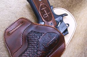 Modern holsters are made in a variety of styles. The holsters are crafted in the same manner as the western holsters. I use paddleclips, leather loops and metal clips to secure the holster. All the modern holsters are wet molded to customize the holster to your gun making it a very secure fit.